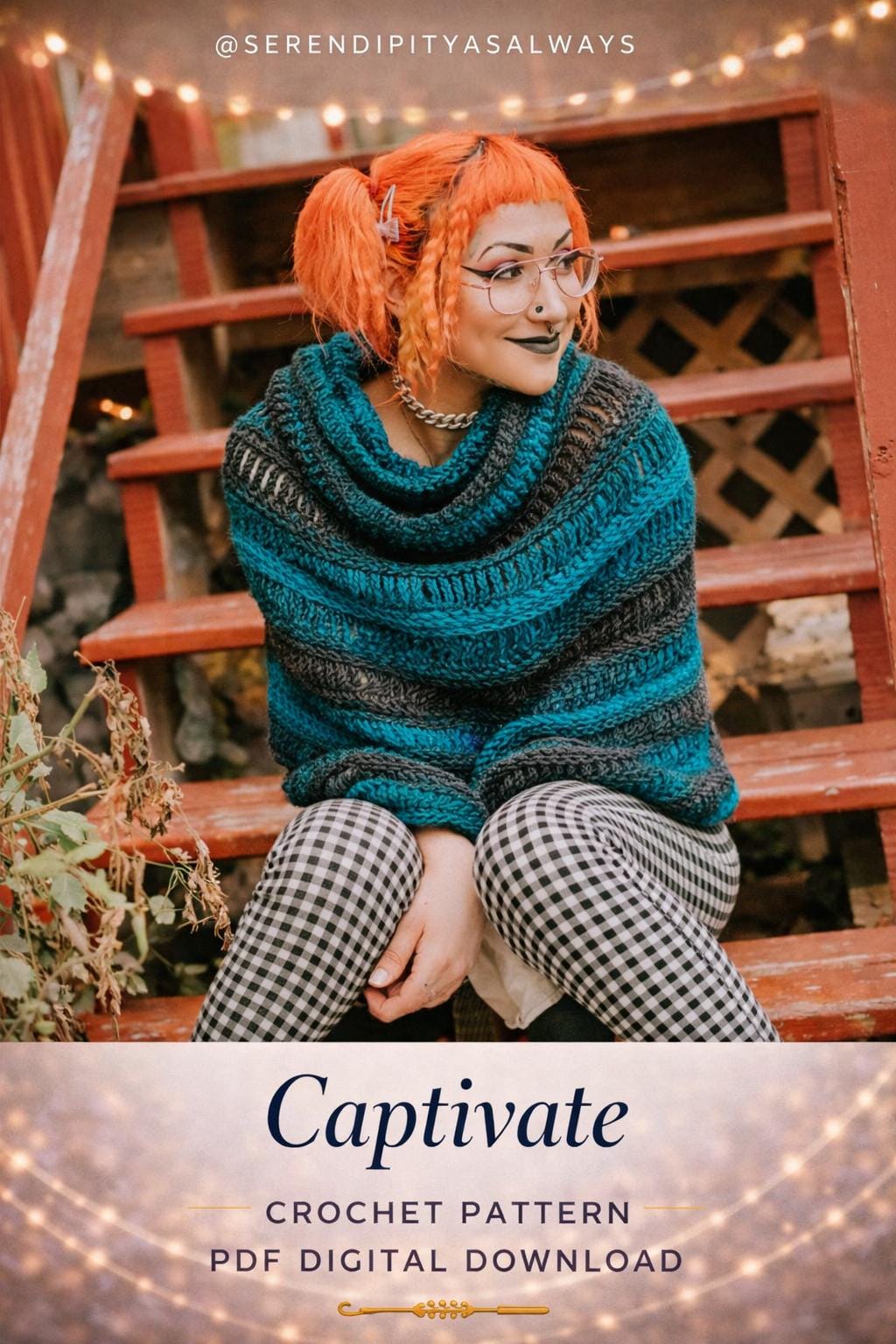 Written instructions provided as a PDF digital download to create the "Captivate" cowl neck cloche in adult one size.
